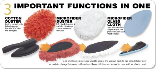 Includes one wax treated duster, one MicroFiber duster, and two MicroFiber glass cloth bonnets. Handle rotates 180 degrees.