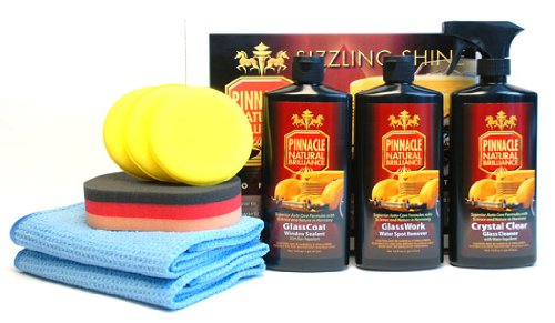 The Pinnacle Crystal Clear Glass Kit is the definitive answer to the problem that so many car care enthusiasts seek an answer to - and that's how to achieve crystal clear glass, inside and out. Rest assured, the Pinnacle Crystal Clear Glass Kit includes the best glass cleaner, water spot remover and water repellent that money can buy - or else they wouldn't have the Pinnacle name on them. Remove the water spots, mineral deposits and other contaminants that find their way to your vehicle's interior and exterior glass surfaces and see clearly again with the Pinnacle Crystal Clear Glass Kit. 16.o